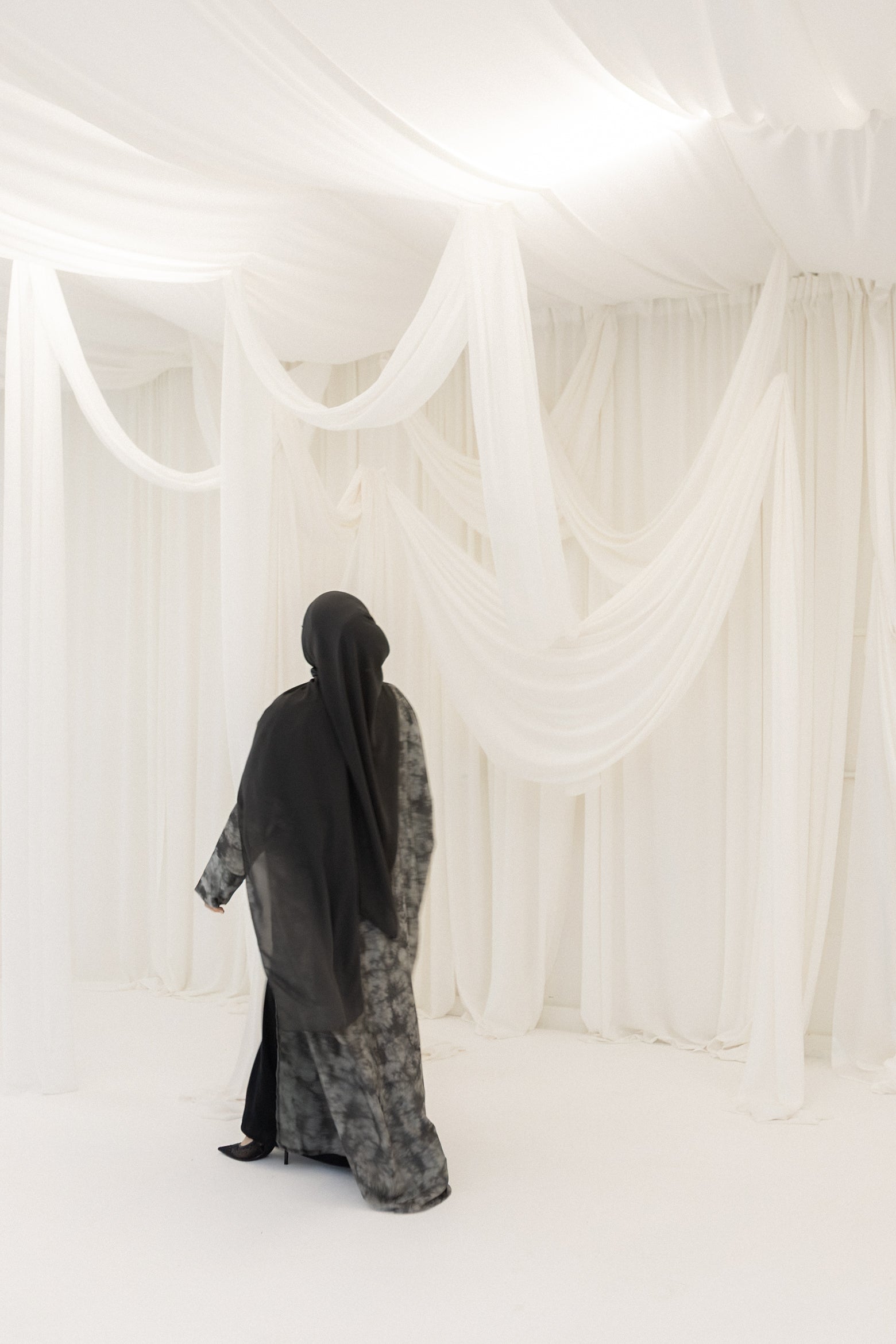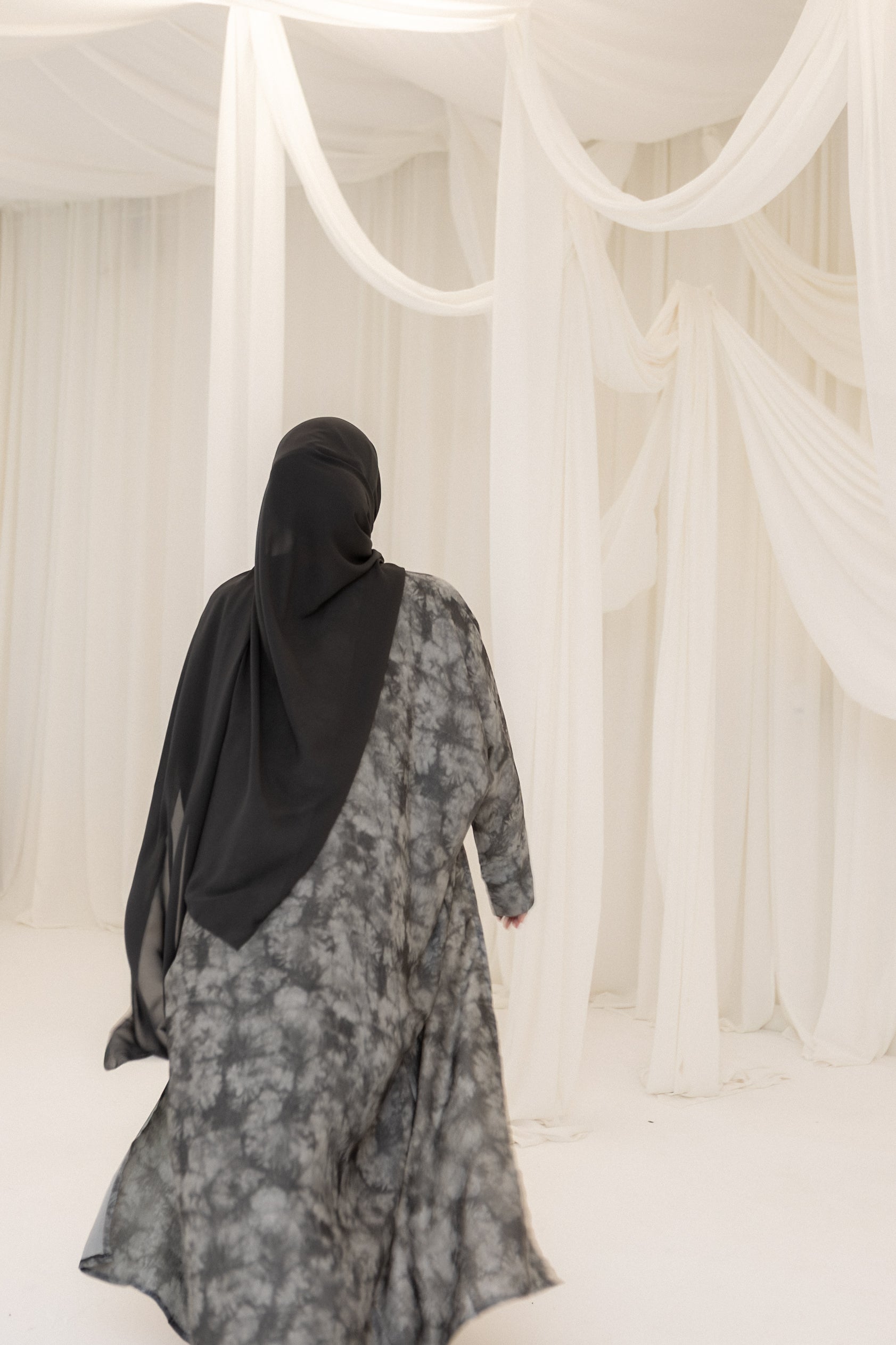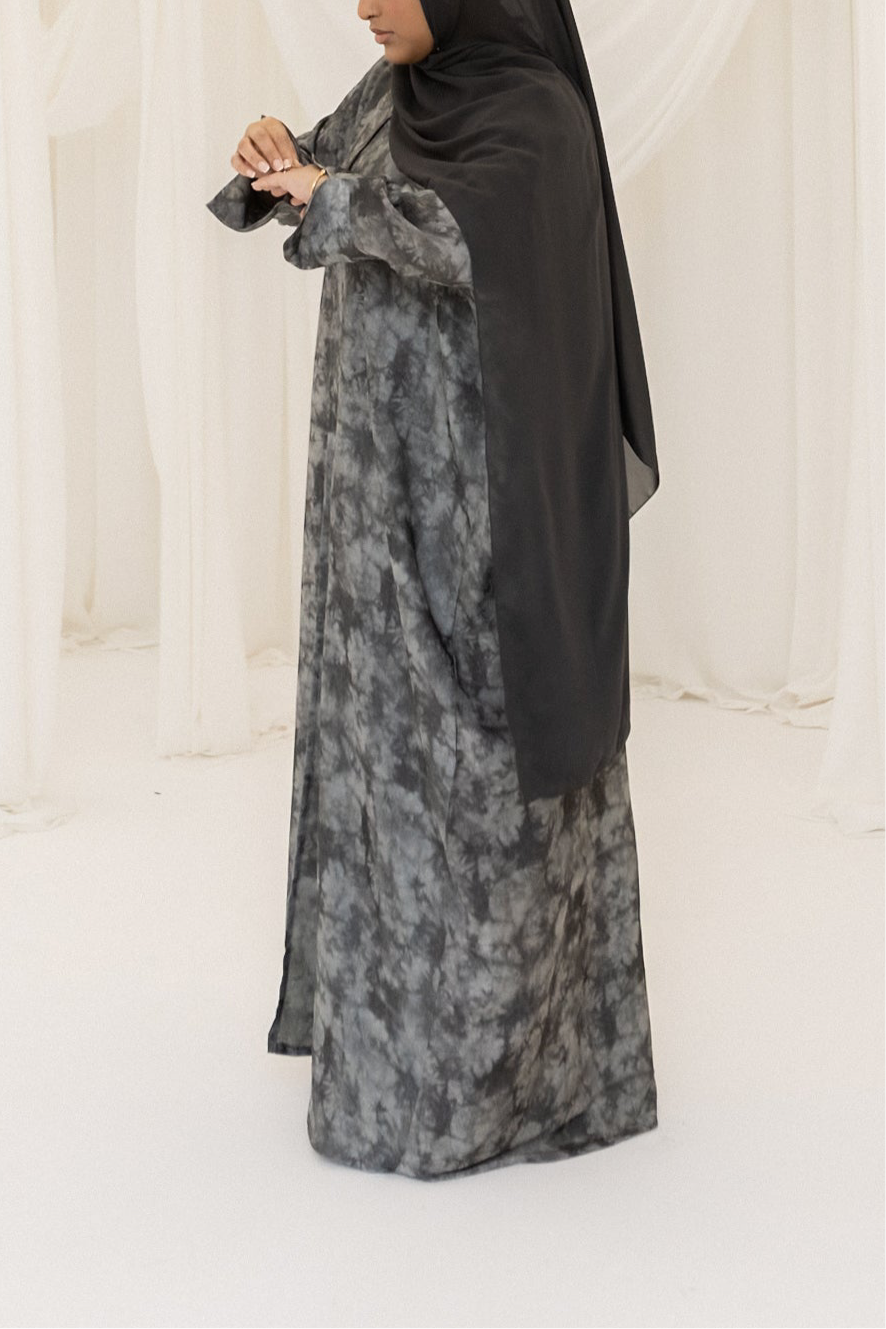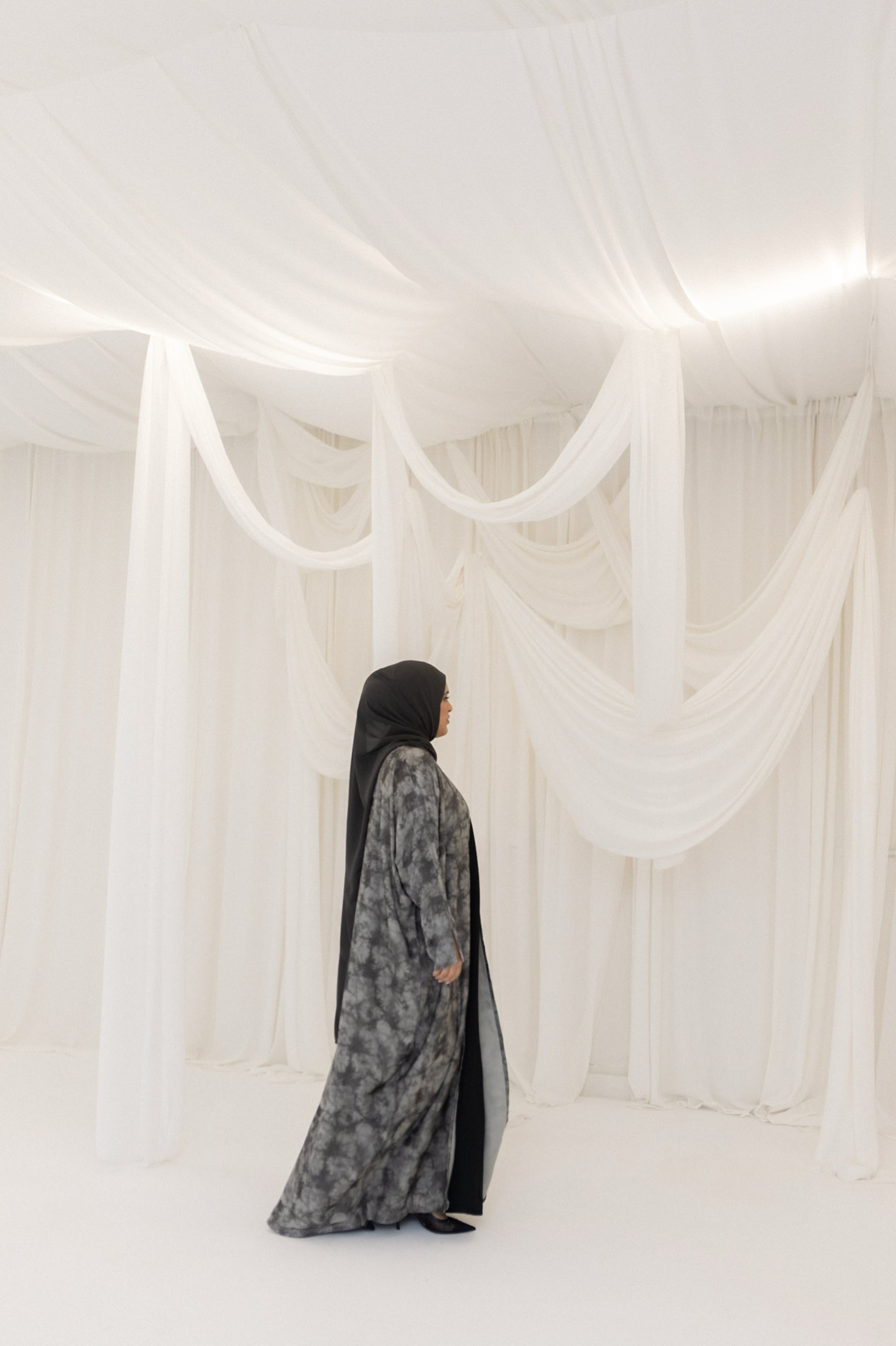 A timeless open abaya crafted in our signature smoked texture set in grey tones, designed for effortless elegance with added versatility. From premium textured crepe with a soft matte finish, designed to drape effortlessly while maintaining elegant structure.