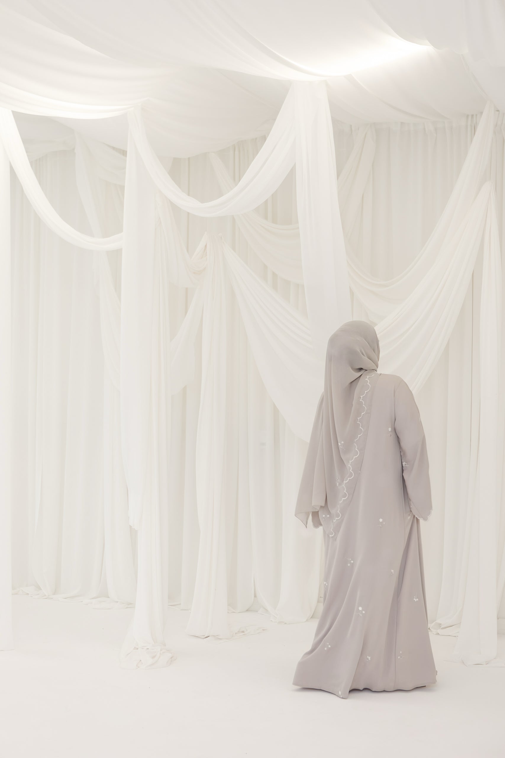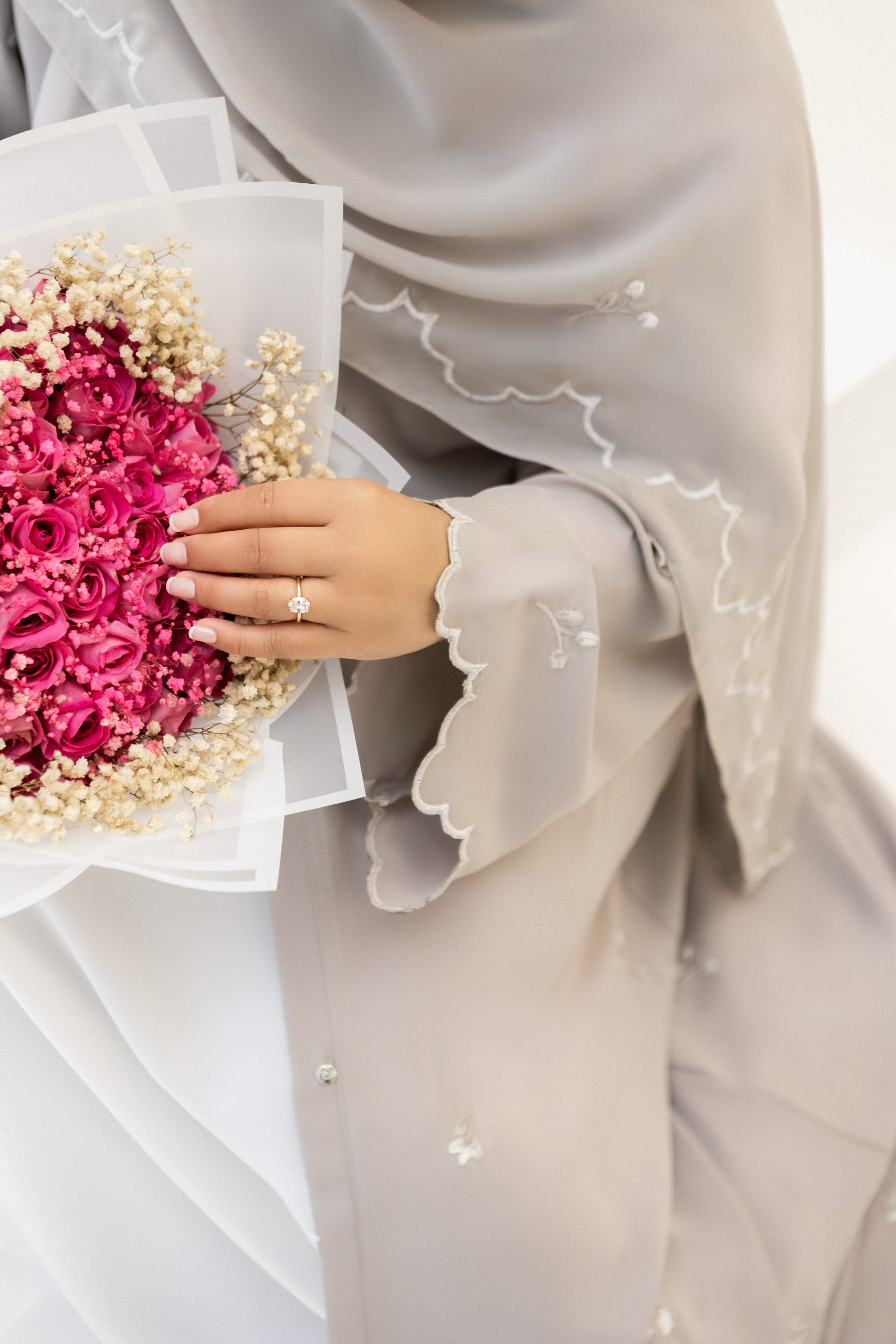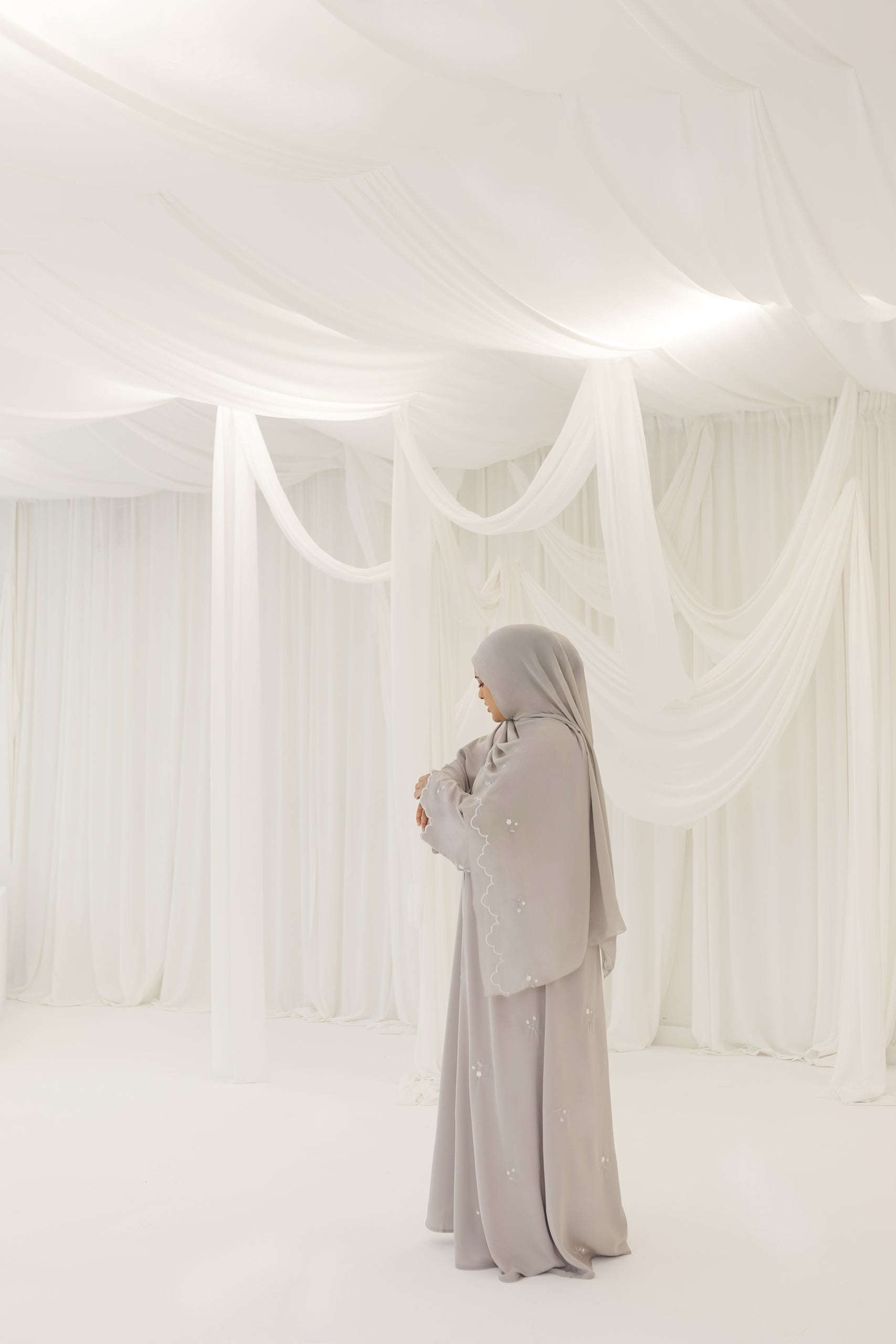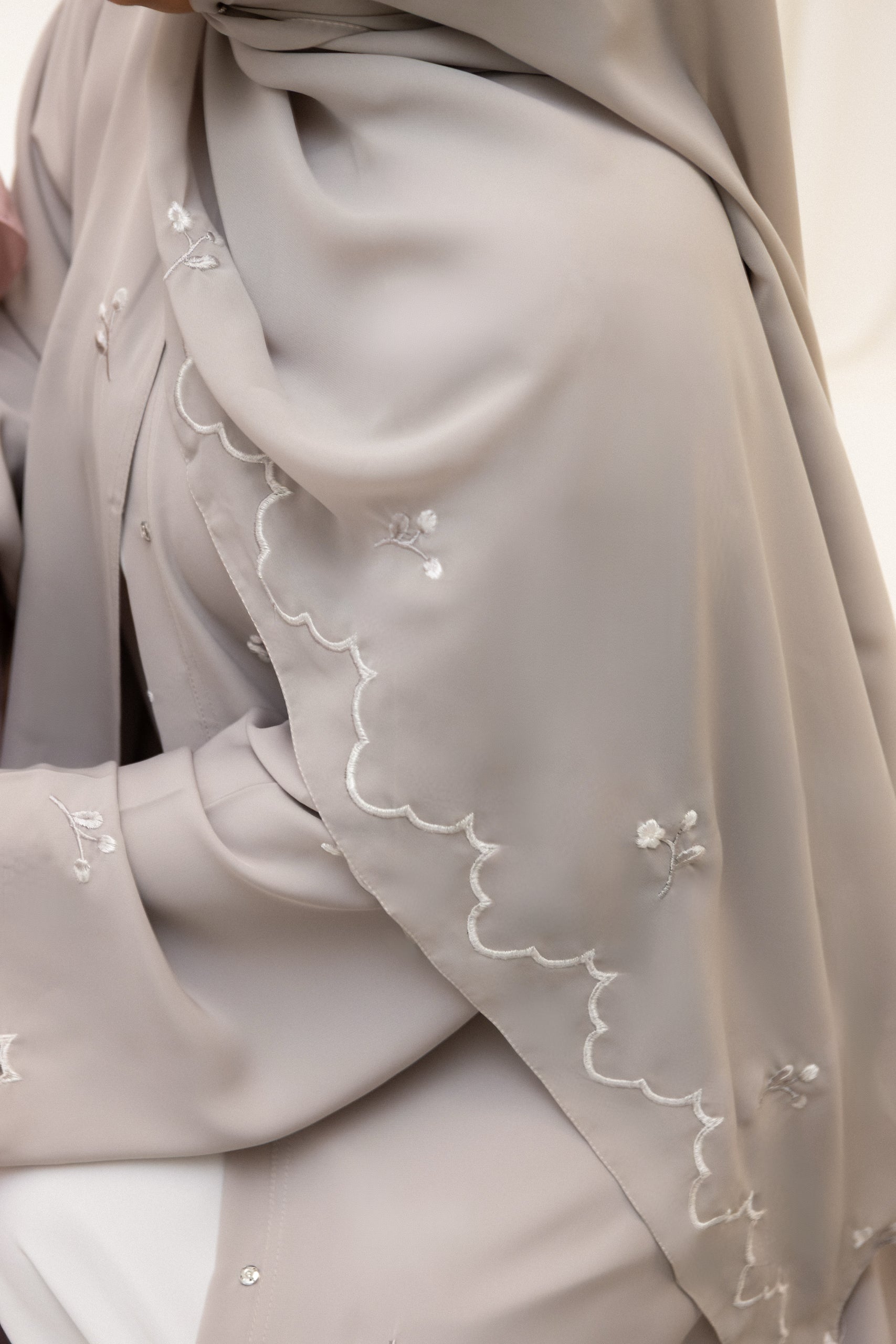 The floral abaya in Inès Bloom (Stone Grey) effortlessly combines elegance and comfort, making it a timeless choice for both everyday wear and special occasions. Crafted from premium Korean Nida, it drapes fluidly with every movement.